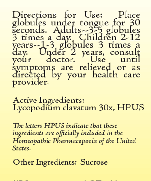 Directions for Use: For best results place globules under the tongue for 30 seconds. Adults-3-5 globules 3 times a day. Children 2-12 years-1-3 globules 3 times a day.  Under 2 years, consult your doctor. Use until symptoms are relieved or as directed by your health care provider.