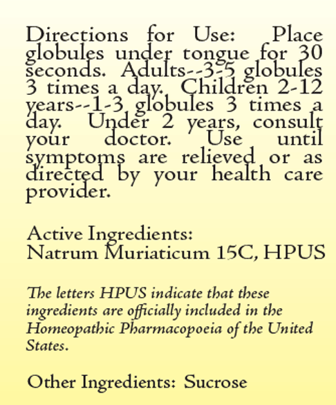 Directions for Use: For best results place globules under the tongue for 30 seconds. Adults-3-5 globules 3 times a day. Children 2-12 years-1-3 globules 3 times a day. Under 2 years, consult your doctor. Use until symptoms are relieved or as directed by your health care provider.