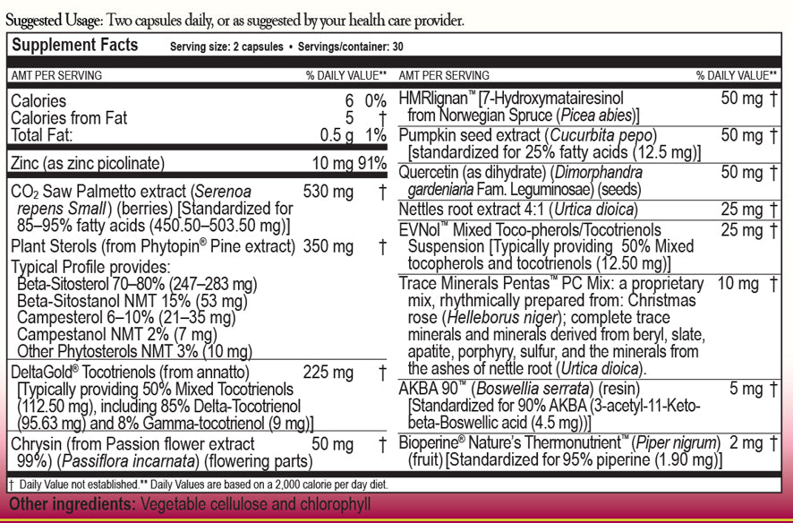 - Beta-Sitosterol- to ensure effectiveness we have included nearly double the amounts shown to be necessary in most studies. Beta Sitosterols promote normal prostaglandin levels and reduce prostate irritation.