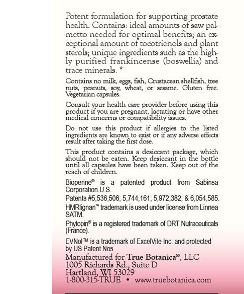 - Boswellia, standardized to 90% of its most potent fraction, the AKBA, - only True Botanica offers this essential component that maintains a healthy inflammation level in the prostate and sustains a healthy prostate cell division.*