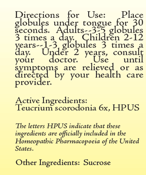 Directions for Use: For best results place globules under the tongue for 30 seconds. Adults-3-5 globules 3 times a day. Children 2-12 years-1-3 globules 3 times a day. Under 2 years, consult your doctor. Use until symptoms are relieved or as directed by your health care provider.